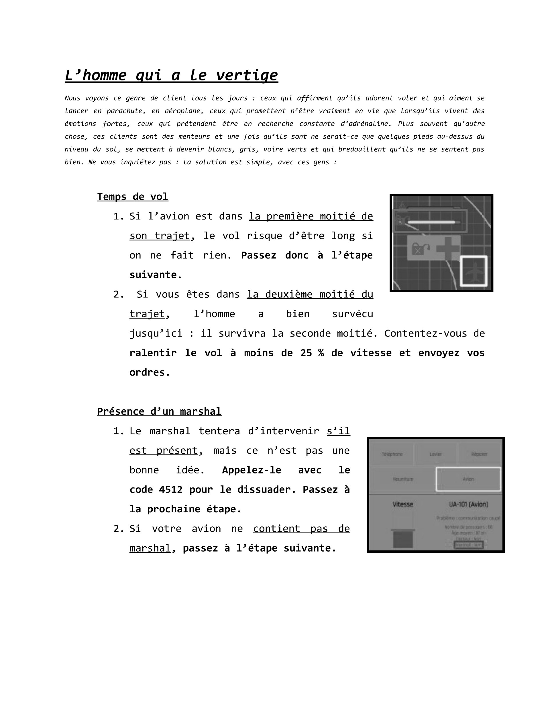 The player who owns the procedures only has the physical document of the guide to the procedures to do when a problem is available. When a problem occurs, the flight manager must give certain informations so that the manager can tell him what actions to take to resolve the problem. Each problem has a different solution and these can change over time. So this player must read the instructions to solve the problems.